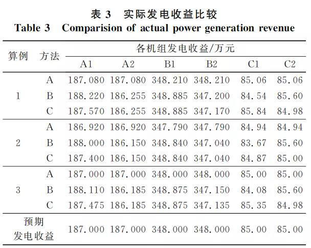 由于機組基數(shù)偏差電量情況不同,3個場景下全部機組的實際總收益也不同,分別為1240.7,1239.3,1240萬元。其中在場景3中,同樣成本的機組產(chǎn)生的負偏差電量與正偏差電量相等,相當于不同成本之間的電量未發(fā)生替代,因此其機組實際總收益與系統(tǒng)無偏差電量情況下的機組總收益相同,均為1240萬元;場景1的系統(tǒng)凈效果相當于成本低的電量代替了成本高的電量,使得系統(tǒng)整體運行經(jīng)濟性上升,機組實際總收益也提高至1240.7萬元;而場景2相當于成本高的電量代替了成本低的電量,系統(tǒng)整體經(jīng)濟性有所下降,機組實際總收益下降至1239.3萬元。