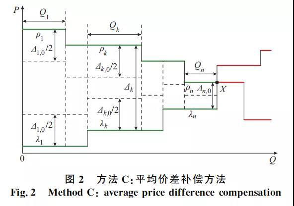 所有成交對中,價差小于平均價差的按實際價差結(jié)算;價差大于平均價差的按平均價差結(jié)算。由此得到每一個成交對的結(jié)算價差。具體撮合方法如圖2所示。圖中:ρk為成交對k中購買方機組的上網(wǎng)價格;λk為成交對k中出售方機組的發(fā)電價格; Δk為成交對k的結(jié)算價差。