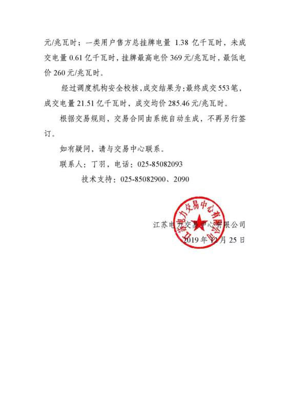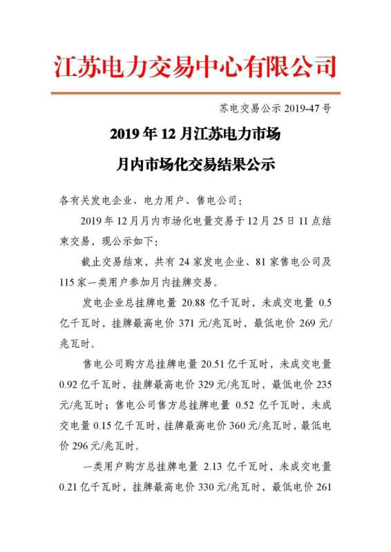 2019年12月江蘇電力市場(chǎng)月內(nèi)市場(chǎng)化交易結(jié)果公示