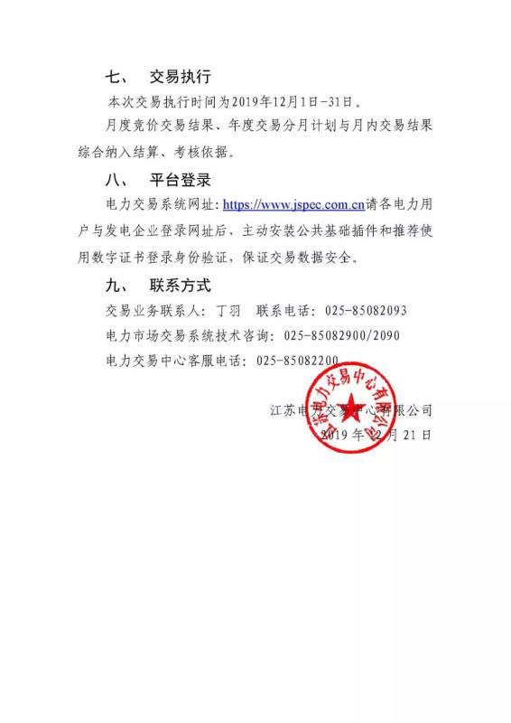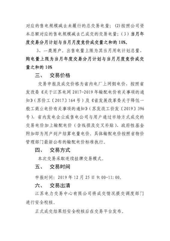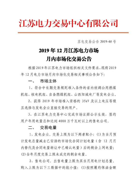 2019年12月江蘇電力市場月內(nèi)市場化交易公告