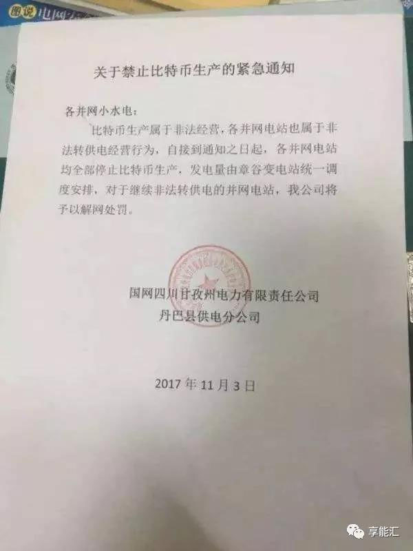 互聯(lián)網(wǎng)上流傳著一張2017年11月3日,落款為國網(wǎng)四川甘孜州電力有限責(zé)任公司丹巴縣供電分公司下發(fā)的《關(guān)于禁止比特幣生產(chǎn)的緊急通知》的文件,該文件要求各并網(wǎng)電站停止比特幣生產(chǎn),電量由變電站統(tǒng)一調(diào)度。這份文件隨后由國家電網(wǎng)四川省電力公司證實(shí)是丹巴縣供電分公司下發(fā)的通知,原因是當(dāng)?shù)剡M(jìn)入枯水期后,發(fā)電量已經(jīng)無法滿足民生需求,而有部分中小電站并沒有供電資質(zhì),卻還在給礦場發(fā)電,才緊急發(fā)布的這一通知。