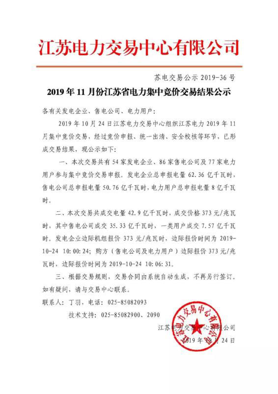 中國(guó)儲(chǔ)能網(wǎng)訊:江蘇電力交易中心于2019年10月24日發(fā)布了關(guān)于11月份江蘇省電力集中競(jìng)價(jià)交易結(jié)果公示。
