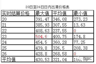 日內結算價格最高值出現(xiàn)在23日(周一),為504.6元/MWH, 日內出清電價最低值出現(xiàn)在22日(周日)和26日(周四),為0元/MWH,七日平均日內出清電價為321.04元/MWH。低于標桿電價73.86元/MWH。