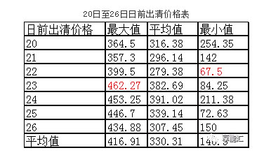 日前出清電價最高值出現(xiàn)在23日(周一),為462.27元/MWH, 日前出清電價最低值出現(xiàn)在22日(周日),為67.5元/MWH,七日平均日前出清電價為330.31元/MWH。低于標桿電價64.59元/MWH。
