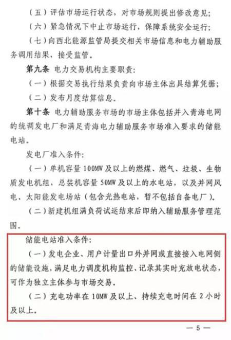 中國儲能網訊:日前青海電力輔助服務市場化交易試運行在青海西寧啟動,青海電力市場建設進入新階段。依據《青海電力輔助服務市場運營規(guī)則(試行)》,儲能電站可作為市場主體參與調峰等輔助服務,電網調用儲能設施參與青海電網調峰價格暫定0.7元/千瓦時。準入條件為發(fā)電企業(yè)、用戶側或電網側儲能設施,充電功率在10MW以上、持續(xù)充電時間2小時以上。