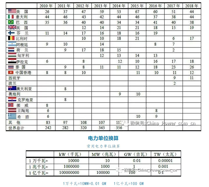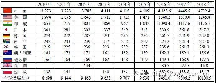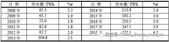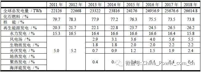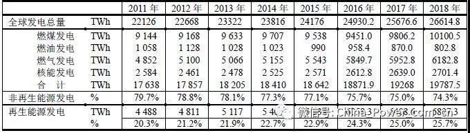 電力可來(lái)自非再生能源發(fā)電和再生能源發(fā)電。表中2010~2015年數(shù)據(jù)來(lái)自國(guó)際能源署(IEA)《Key world energy statistics》報(bào)告的數(shù)據(jù),而2016~2018年《BP Statistical Review of World Energy June 2018-2019》的數(shù)據(jù)。