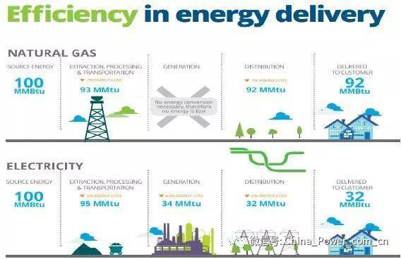 根據(jù)世界氣體協(xié)會(huì)(IGU)發(fā)布的《Natural Gas:The Energy for today and future 2017》的報(bào)告中,講述能源輸送的損失,100份天然氣到用戶可以獲得92份,而100份電力來(lái)源,輸送到用戶,只能獲得32份。