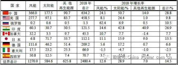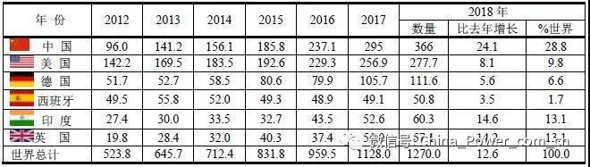2018年水力發(fā)電仍然霸占再生能源發(fā)電的主導(dǎo)地位,占再生能源發(fā)電的15.8/26.2=60.3%,其次是風(fēng)力發(fā)電5.5/26.2=21.0%、太陽(yáng)能光伏2.4/26.2=9.2%和生物質(zhì)發(fā)電2.2/26.2=8.4%。2018年底再生能源發(fā)電量足以供應(yīng)全球發(fā)電量的26.2%。
