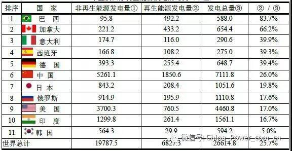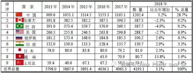 水力發(fā)電量最多的國(guó)家(單位:TWh)