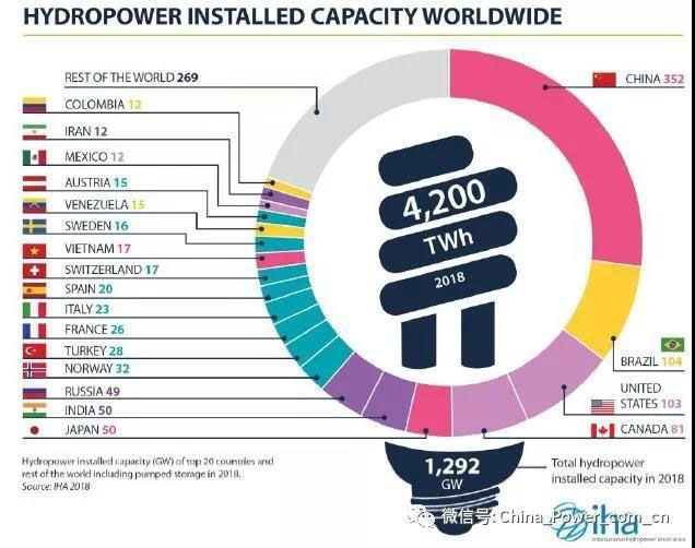 根據(jù)《International Hydropower Association,iha(國(guó)際水力發(fā)電協(xié)會(huì))》2019年的報(bào)道,2018年水力發(fā)電總裝機(jī)容量為1292GW,中國(guó)為352GW,占總量的352/1292=27.2%。