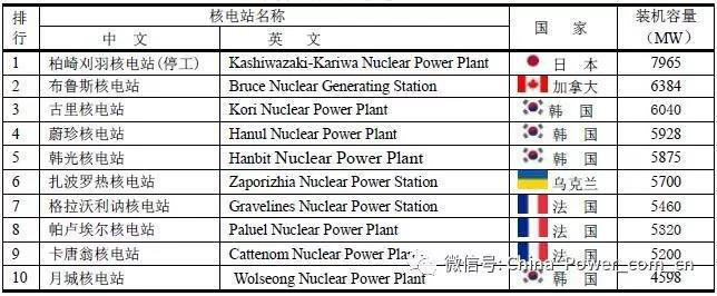 世界上最大的核電站是日本柏崎刈羽核電站,裝機(jī)容量為7965MW,但2011年已經(jīng)停工。值得注意的是韓國(guó)核電站進(jìn)展很快,前十位核電站就占有4席,把美國(guó)和日本都摔到后面。