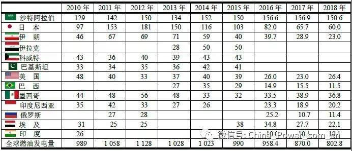 燃油發(fā)電在化石燃料發(fā)電份額中不占重要地位,而且逐步在降低。2018年僅占全球發(fā)電總量的802.8/26614.8=3.0%,比去年870.0/25676.6=3.4%減少了0.4%。燃油發(fā)電最多的國(guó)家是沙特阿拉伯,占燃油發(fā)電總量的150.6/802.8= 18.6%,其次是日本,占60.0/802.8= 7.5%。