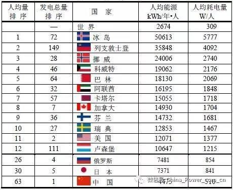 人均能源消費(fèi)量和人均耗電量在一定程度上反映一個(gè)國(guó)家或地區(qū)經(jīng)濟(jì)發(fā)展水平和人民生活水平。根據(jù)美國(guó)中央情報(bào)局2016年的數(shù)據(jù),人均能源消費(fèi)量和人均耗電量最多的國(guó)家是冰島和列支敦士登。雖然中國(guó)電力產(chǎn)量居世界首位,但人均能源消耗量居世界第63位。