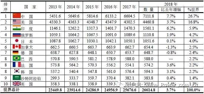 2013~2018年主要國(guó)家的電力生產(chǎn)量(單位:TWh)