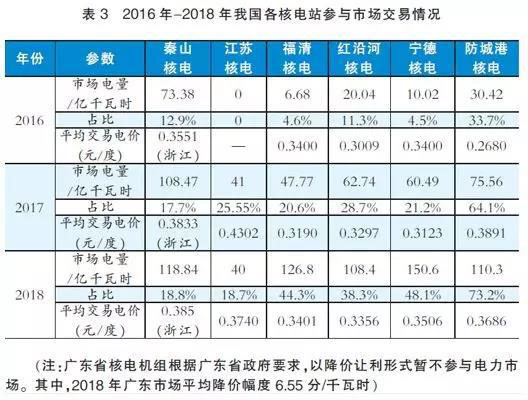 我國正在深化電力體制改革。從市場交易電量及市場化比率來看,核電企業(yè)市場化程度呈現逐年增加的趨勢,在運核電面臨計劃電量下調和市場競價的雙重壓力。根據2016年-2018年我國各核電站參與市場交易情況(見表3),部分省區(qū)核電部分電量競價上網時,已出現成本與電價成本倒掛的情況。部分省份在深化電改過程中,指令性下調核電計劃電量在內的上網電價,使核電電價進一步降低。