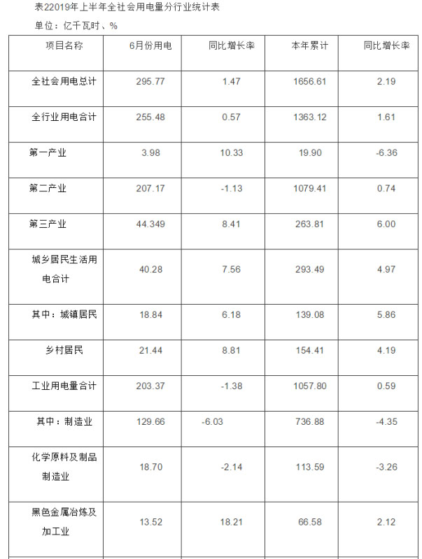 (一)全社會(huì)用電量情況。全省全社會(huì)用電量295.77億千瓦時(shí),同比增長(zhǎng)1.47%;截止6月底,累計(jì)用電量1656.61億千瓦時(shí),同比增長(zhǎng)2.19 %。
