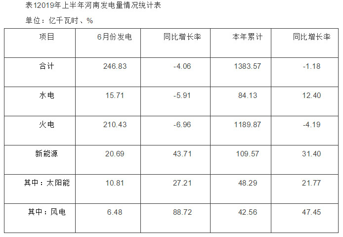 (一)發(fā)電量情況。截止6月底,全省發(fā)電量1383.57億千瓦時(shí),同比減少1.18%。其中水電84.13億千瓦時(shí),同比增長(zhǎng)12.40%;火電1189.87億千瓦時(shí),同比減少4.19%;新能源109.57億千瓦時(shí),同比增長(zhǎng)31.40%。