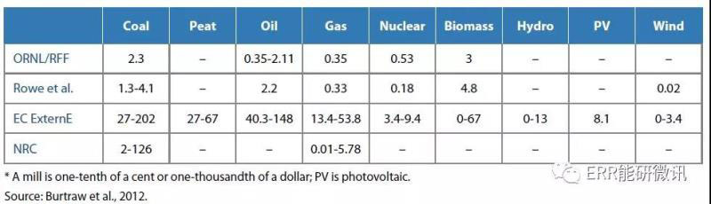 表ES.2:4項(xiàng)外部成本研究的估算匯總(mills*每千瓦時或美元/每兆瓦時)