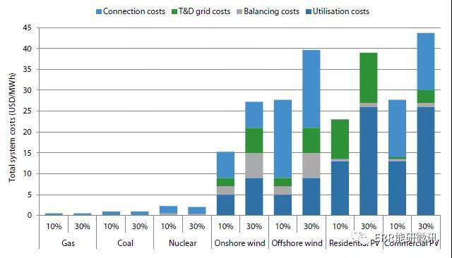 圖ES.3 VRE占10%和30%份額的發(fā)電技術(shù)的電網(wǎng)級系統(tǒng)成本