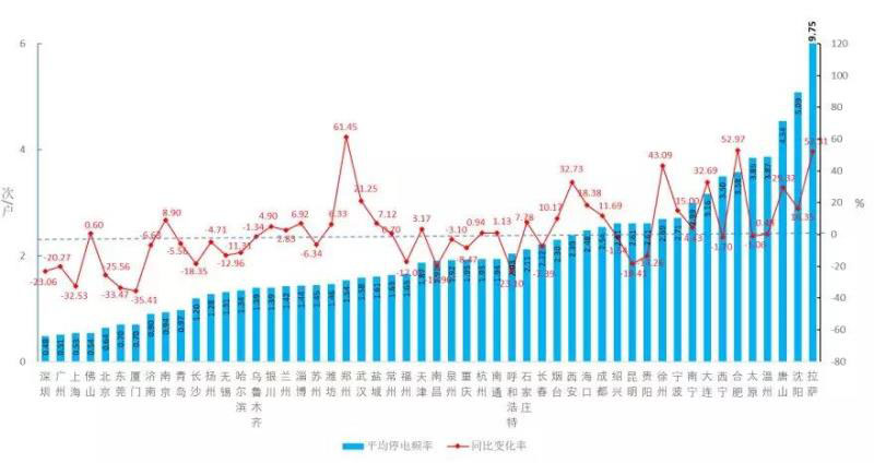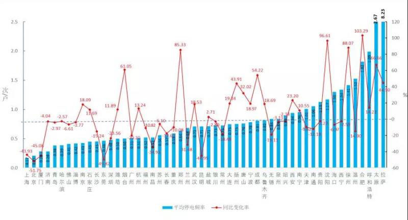 全國52個主要城市中,有14個城市的用戶平均停電頻率同比減少超過10%;22個城市的用戶平均停電頻率波動超過15%,其中,廈門、東莞、上海的用戶平均停電頻率同比分別減少35.41%、33.47%、32.53%,鄭州、合肥、拉薩的用戶平均停電頻率同比分別增加61.45%、52.97%、52.31%。