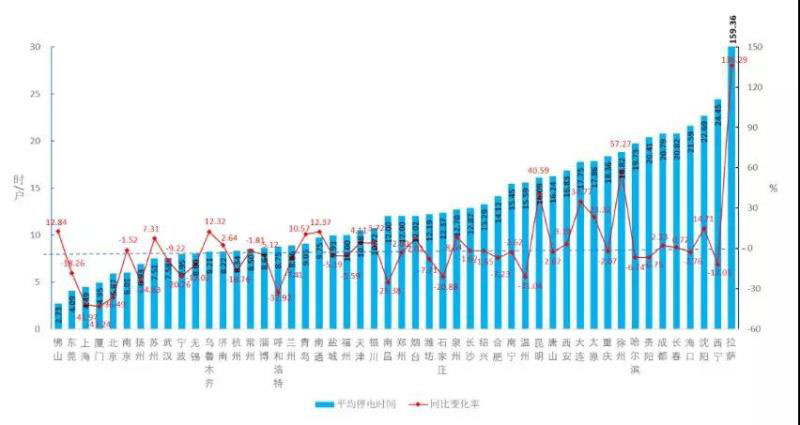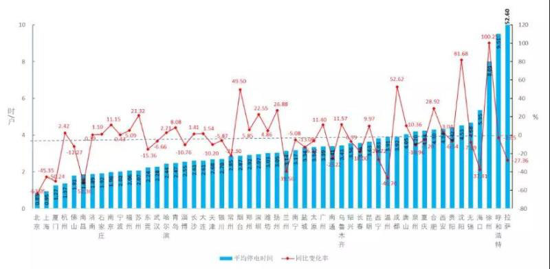 全國52個主要城市中有18個城市的用戶平均停電時間同比減少超過10%;13個城市的用戶平均停電時間波動超過20%,其中,廈門、上海、北京的用戶平均停電時間同比分別減少45.65%、42.41%、41.87%;徐州、昆明的用戶平均停電時間同比分別增加64.20%、32.43%。