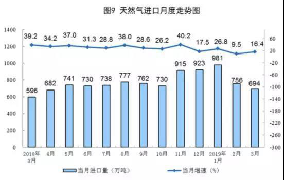 3月份,進(jìn)口天然氣694萬(wàn)噸,同比增長(zhǎng)16.4%。1季度,天然氣進(jìn)口量同比增長(zhǎng)17.8%。