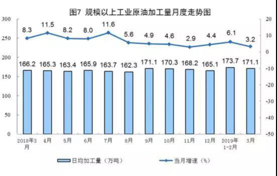 3月份,原油加工量同比增長(zhǎng)3.2%,增速比1—2月份回落2.9個(gè)百分點(diǎn);日均加工171.1萬(wàn)噸,比1—2月份日均減少2.6萬(wàn)噸。1季度,原油加工量15537萬(wàn)噸,同比增長(zhǎng)4.4%,比去年同期回落3.1個(gè)百分點(diǎn)。