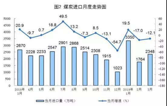 3月份進(jìn)口煤炭2348萬(wàn)噸,同比下降12.1%,連續(xù)兩個(gè)月降幅達(dá)兩位數(shù)。1季度煤炭進(jìn)口量同比下降1.8%。