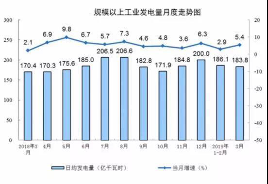 3月份,全國(guó)發(fā)電量5697.9億千瓦時(shí),日均發(fā)電183.8億千瓦時(shí),同比增長(zhǎng)5.4%,增速比1—2月份加快2.5個(gè)百分點(diǎn)。1季度,全國(guó)發(fā)電量達(dá)16747.4億千瓦時(shí),同比增長(zhǎng)4.2%,增速比去年同期回落3.8個(gè)百分點(diǎn)。