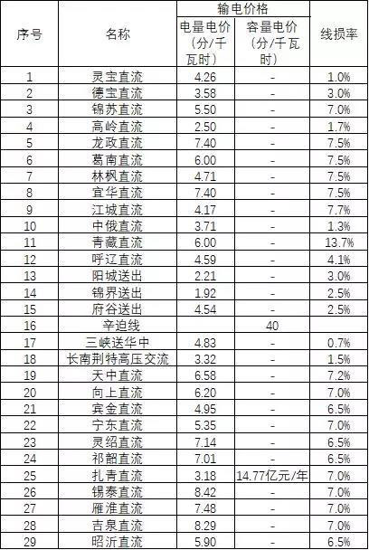 根據(jù)國家發(fā)展改革委《關(guān)于調(diào)整寧東直流等專項(xiàng)工程2018-2019年輸電價格的通知》(發(fā)改價格(2018 ) 225號)、《關(guān)于核定酒泉一湖南、寧東一紹興±800千伏特高壓直流工程輸電價格的通知》(發(fā)改價格(2018 ) 684號)及《關(guān)于核定部分跨省跨區(qū)專項(xiàng)工程輸電價格有關(guān)問題的通知》(發(fā)改價格〔2018 ] 1227號)文要求,公司各專項(xiàng)工程輸電價格如表所示。