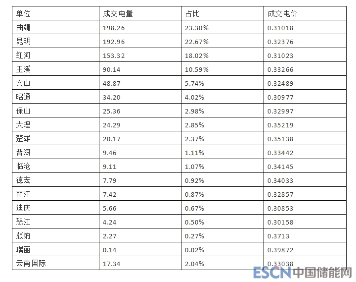 分地區(qū)來(lái)看,昆明、曲靖、紅河、玉溪地區(qū)用戶(hù)的市場(chǎng)化交易電量達(dá)634.68億千瓦時(shí),占全部市場(chǎng)化交易電量的76.13%,其中曲靖地區(qū)成交198.3億千瓦時(shí),占全部交易電量的 23.78%;昆明地區(qū)成交193億千瓦時(shí),占全部交易電量的23.15%;紅河地區(qū)成交153.3億千瓦時(shí),占全部市場(chǎng)化交易電量的18.39%;玉溪地區(qū)成交90.1億千瓦時(shí),占全部市場(chǎng)化交易電量的10.81%。
