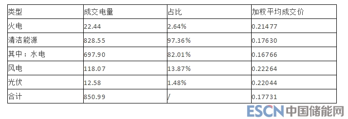 2018 年,市場(chǎng)化電廠(chǎng)在省內(nèi)市場(chǎng)累計(jì)成交電量 850.99 億千瓦時(shí),同比增長(zhǎng) 21.03%,以水電為主的清潔能源成交電量 828.55億千瓦時(shí),占總成交電量的 97.36%,平均成交價(jià)每千瓦時(shí)0.17630元,其中,水電成交電量697.9億千瓦時(shí),占總成交電量的82.01%,平均成交價(jià)每千瓦時(shí)0.16766元;風(fēng)電成交電量118.07億千瓦時(shí),占總成交電量的13.87%,平均成交價(jià)每千瓦時(shí)0.22264元;光伏成交電量12.58億千瓦時(shí),占總成交電量的1.48%,平均成交價(jià)每千瓦時(shí)0.22044元?;痣姵山浑娏?2.44億千瓦時(shí),占總成交電量的2.64%,平均成交價(jià)每千瓦時(shí)0.21477元。