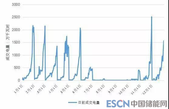 從每日成交情況來(lái)看,由于僅次日用電需求超出日前電量交易申報(bào)基準(zhǔn)值的部分,才可參與日前電量交易,在月初的時(shí)候日前電量交易參與用戶(hù)數(shù)、電量規(guī)模往往較小,隨著時(shí)間推移,到月末時(shí)參與用戶(hù)數(shù)與交易規(guī)模均達(dá)到最高值。 2018年,最高成交電量發(fā)生在 11 月30日,成交電量2513萬(wàn)千瓦時(shí)。2018年日前電量交易成交電量曲線(xiàn)如下圖所示。