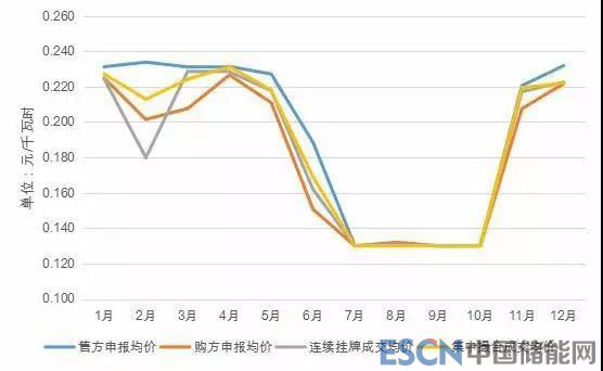 隨著市場(chǎng)規(guī)則的不斷完善和市場(chǎng)主體市場(chǎng)意識(shí)的不斷增強(qiáng),2018年,大部分市場(chǎng)主體選擇通過(guò)雙邊協(xié)商的方式參與市場(chǎng),集中撮合交易成交規(guī)模不斷縮減,成交電量占月度市場(chǎng)成交電量的比例較2017年降低 13.14個(gè)百分點(diǎn),其中最高占比為2.04%(2月),最低僅占0.04%(10月)。雖然月度集中撮合交易市場(chǎng)占比進(jìn)一步縮減,但是月度集中撮合交易依然發(fā)揮著發(fā)現(xiàn)市場(chǎng)價(jià)格信號(hào)的作用,主要體現(xiàn)在:一是雙邊交易中,很多市場(chǎng)主體以集中撮合交易平均成交價(jià)為“標(biāo)桿”,按照約定的浮動(dòng)機(jī)制來(lái)確定雙邊交易電量的最終成交價(jià);二是連續(xù)掛牌交易中,市場(chǎng)主體通常將參考集中撮合交易平均成交價(jià)進(jìn)行報(bào)價(jià);三是售電公司的價(jià)格保底服務(wù)模式中,通常將用戶(hù)成交價(jià)低于集中撮合交易平均成交價(jià)作為收取交易服務(wù)費(fèi)的前提條件。2018年,月度集中撮合交易平均成交價(jià)每千瓦時(shí)0.21540元,在枯平期的1至5月價(jià)格比較平穩(wěn),維持在每千瓦時(shí)0.22元左右,6月份由于開(kāi)始進(jìn)入雨季,市場(chǎng)普遍預(yù)期電量供給增加,交易平均成交價(jià)為每千瓦時(shí)0.169元,在主汛期7至10月份均為“地板價(jià)”每千瓦時(shí)0.13元,11、12月逐步回升至每千瓦時(shí)0.22205元。