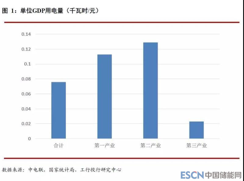 從各產(chǎn)業(yè)GDP的增量來看,第三產(chǎn)業(yè)的GDP增量為33167億元,拉動GDP增長3.9個百分點;第二產(chǎn)業(yè)GDP增量為20064億元,拉動GDP增長2.4個百分點,第一產(chǎn)業(yè)GDP增量為2189億元,拉動GDP增長0.3個百分點。第二產(chǎn)業(yè)的GDP增量和增速雖然均不及第三產(chǎn)業(yè),但是第二產(chǎn)業(yè)的單位GDP增量所帶來的用電量是要高于第三產(chǎn)業(yè),二者分別為0.18千瓦時/元和0.037千瓦時/元。也就是說,第二產(chǎn)業(yè)每增加1元GDP所消耗的電量是第三產(chǎn)業(yè)的4.3倍。而第一產(chǎn)業(yè)的單位GDP增量所帶來的用電量更是高達0.3千瓦時/元,是第三產(chǎn)業(yè)的8.1倍。2018年全年第一、二、三產(chǎn)業(yè)的平均單位GDP用電量分別為0.11、0.19和0.023千瓦時/元。因此,無論從GDP增量所帶來的用電量增量還是從單位GDP用電量的角度來看,調(diào)整經(jīng)濟結(jié)構(gòu),大力發(fā)展第三產(chǎn)業(yè),才能消耗更少的電量創(chuàng)造更多的GDP。