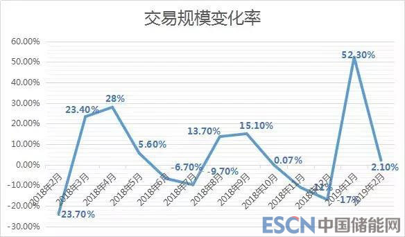 2月份相對(duì)1月份的交易成交規(guī)模有所緩和,相比于2019年1月份江蘇的價(jià)差1毛報(bào)價(jià),本月競(jìng)價(jià)交易的價(jià)差為2.5分,市場(chǎng)趨于穩(wěn)定。相對(duì)于1月份52.3%的變化,市場(chǎng)2月份的變化率為2.1%,相較之下更趨于理性。