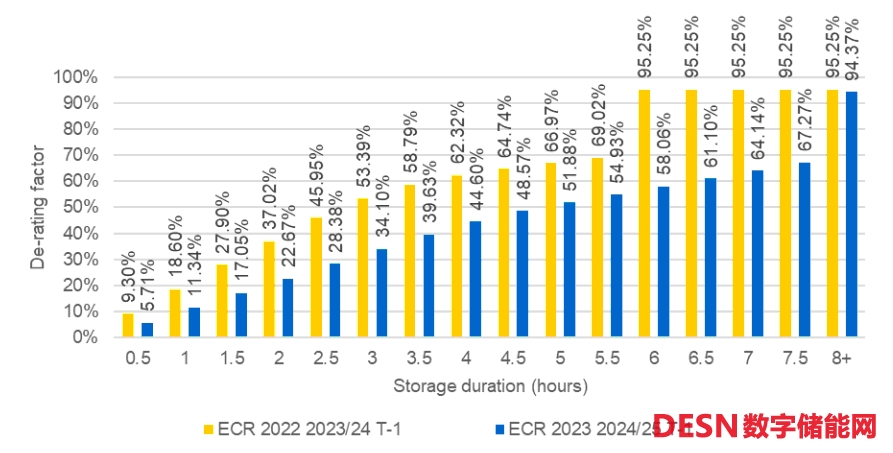 天然氣發(fā)電廠和水力發(fā)電設(shè)施的比例最高,達(dá)到90%~95%,而太陽(yáng)能和風(fēng)能發(fā)電場(chǎng)的比例最低,為5%~12%,這反映了它們發(fā)電的多變性。儲(chǔ)能系統(tǒng)的降級(jí)系數(shù)取決于其持續(xù)時(shí)間,0.5小時(shí)儲(chǔ)能系統(tǒng)的降級(jí)系數(shù)約為4%~5%,8小時(shí)及以上儲(chǔ)能系統(tǒng)的降級(jí)系數(shù)逐步增長(zhǎng)至95%左右。