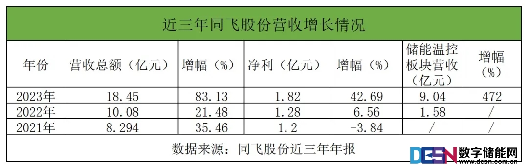 年報顯示,同飛股份2023年實現(xiàn)營業(yè)收入18.45億元,較上年同期增長83.13%;歸屬于上市公司股東的凈利潤1.82億元,較上年同期增長42.69%。其中2023年公司儲能溫控領(lǐng)域的營業(yè)收入約為9.04億元,較2022年增長472%。