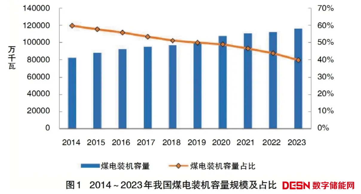 近十年來,煤電裝機規(guī)模得到較好控制(見圖1),雖然2014~2023年煤電裝機容量逐年增長,但其裝機容量占比卻逐年降低,響應了“嚴控煤電裝機規(guī)模”的要求,不盲目新增煤電機組裝機容量,裝機增長明顯放緩。2023年,煤電裝機116500萬千瓦,占全國總裝機容量的39.90%,與2014年相比,裝機占比下降接近20個百分點,發(fā)電側裝機結構低碳化成效顯著。