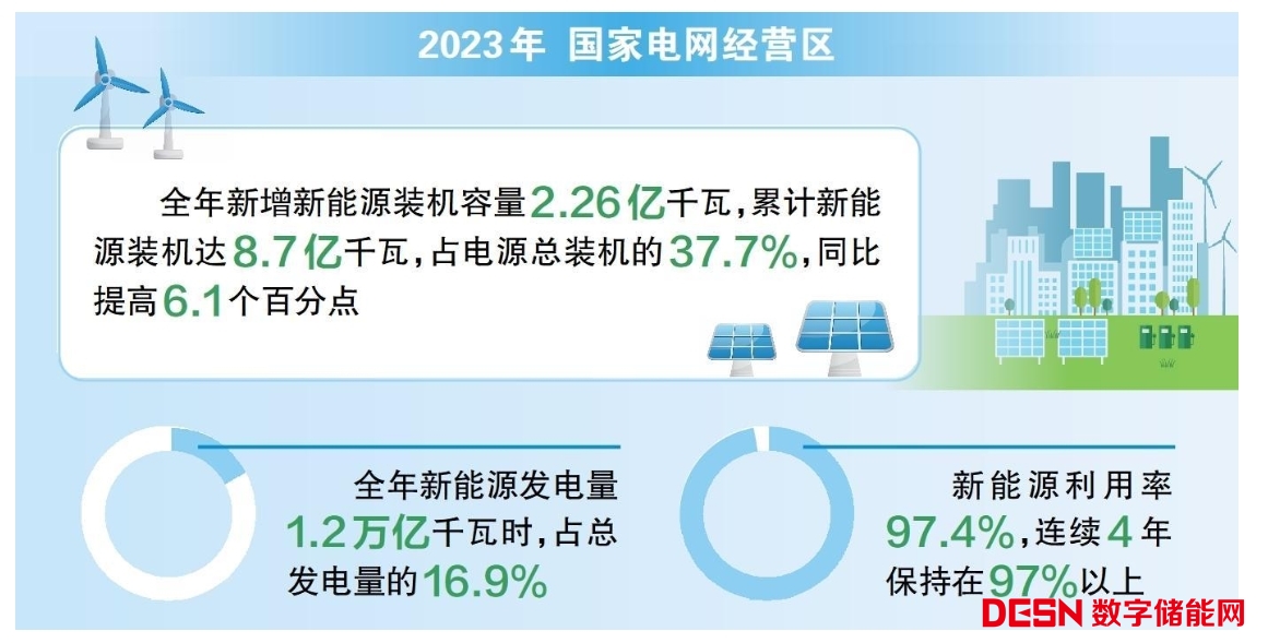 《報告》顯示,2023年公司經(jīng)營區(qū)新能源并網(wǎng)消納主要呈現(xiàn)4個特點:裝機規(guī)模再上新臺階,經(jīng)營區(qū)全年新增新能源裝機容量2.26億千瓦,累計新能源裝機達到8.7億千瓦,占電源總裝機的37.7%,同比提高6.1個百分點;分布式電源成為增長主體;電力電量屢創(chuàng)新高,全年新能源發(fā)電量1.2萬億千瓦時,占總發(fā)電量的16.9%,同比提高2.0個百分點;利用率保持較高水平,新能源利用率97.4%,連續(xù)4年保持在97%以上。