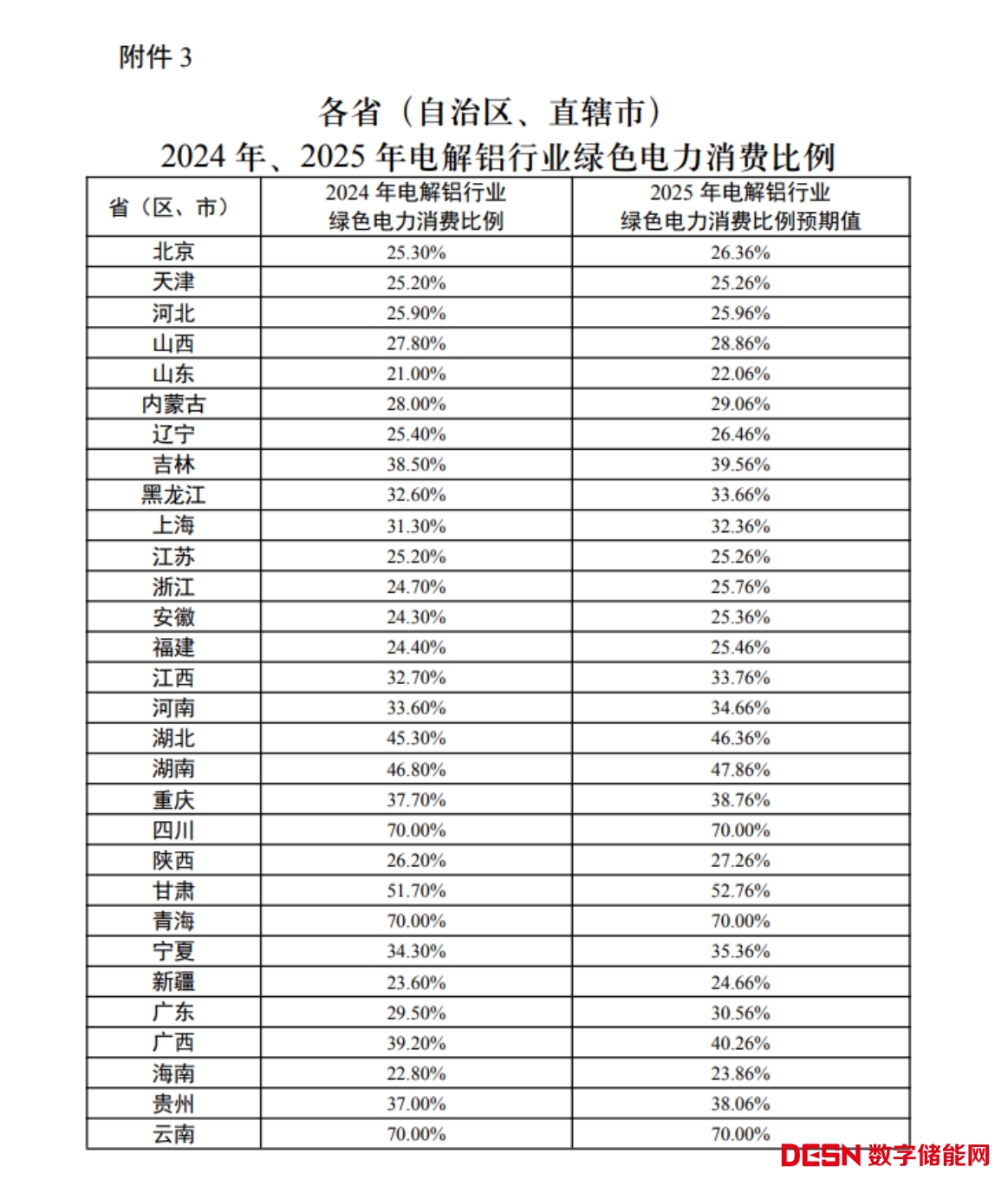 3.各?。ㄗ灾螀^(qū)、直轄市)2024年、2025年電解鋁行業(yè)綠色電力消費(fèi)比例