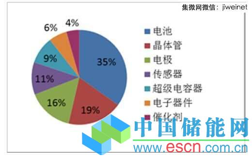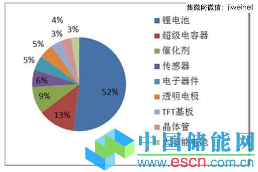 這是來自北京國之專利預(yù)警咨詢中心的數(shù)據(jù),從專利應(yīng)用分布可以看出,有鋰電(動(dòng)力電池)、超級(jí)電容器、微電子、觸摸屏、催化劑、太陽能電池等。先看鋰電沒有大的突破。圖3.