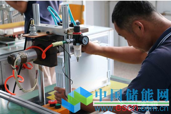 威海東生能源科技有限公司工作人員向中國(guó)電池網(wǎng)演示機(jī)床切割電池