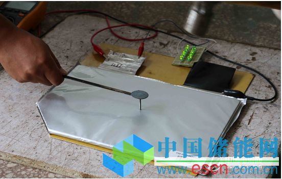 威海東生能源科技有限公司工作人員向中國(guó)電池網(wǎng)演示電池穿刺實(shí)驗(yàn)現(xiàn)場(chǎng)