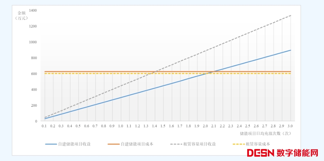 除自建配儲(chǔ)項(xiàng)目外,發(fā)電企業(yè)也可考慮租賃獨(dú)立儲(chǔ)能或共享儲(chǔ)能指標(biāo)。在基礎(chǔ)條件假設(shè)情況下,增加新疆地區(qū)容量租賃成本300元/千瓦/年,峰谷電價(jià)差約0.37元/千瓦時(shí)的假設(shè)條件進(jìn)行測(cè)算可得,預(yù)計(jì)日均放電1.4次的情況下,租賃儲(chǔ)能項(xiàng)目可實(shí)現(xiàn)盈利。