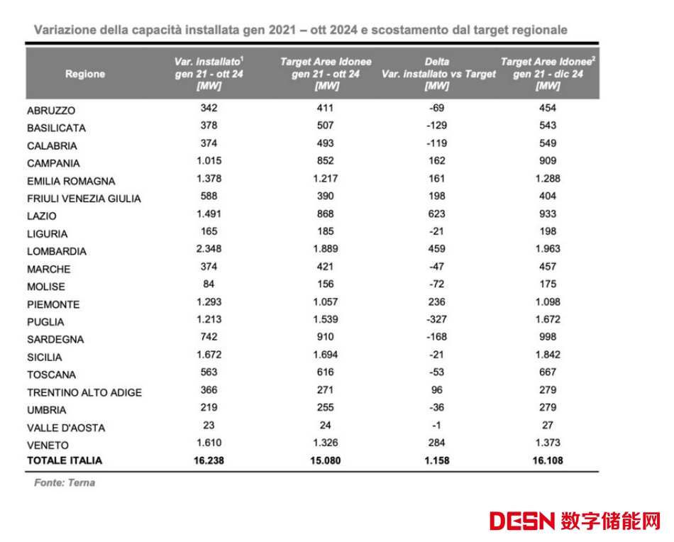 Terna公司表示,將新增的可再生能源發(fā)電項(xiàng)目裝機(jī)容量與意大利政府設(shè)定的可再生能源國(guó)家目標(biāo)(16,108MW)進(jìn)行比較,在2024年已經(jīng)提前兩個(gè)月實(shí)現(xiàn),因?yàn)樵诤线m的地區(qū)已經(jīng)開發(fā)和部署了16,238MW可再生能源發(fā)電設(shè)施。