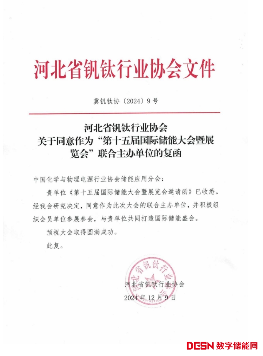 中國(guó)儲(chǔ)能網(wǎng)訊:近日,河北省釩鈦行業(yè)協(xié)會(huì)復(fù)函中國(guó)化學(xué)與物理電源行業(yè)協(xié)會(huì)儲(chǔ)能應(yīng)用分會(huì),同意作為第十五屆中國(guó)國(guó)際儲(chǔ)能大會(huì)暨展覽會(huì)(CIES2025)聯(lián)合主辦單位,并積極組織會(huì)員單位參展參會(huì),與中國(guó)化學(xué)與物理電源行業(yè)協(xié)會(huì)儲(chǔ)能應(yīng)用分會(huì)共同打造這場(chǎng)國(guó)際儲(chǔ)能盛會(huì)。