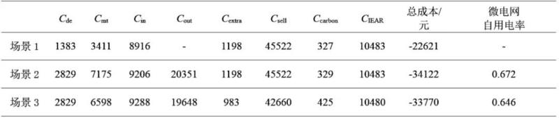 結(jié)果表明,微電網(wǎng)余電上網(wǎng)和直售電模式(表1場(chǎng)景二)相比傳統(tǒng)模式(表1場(chǎng)景一)能顯著提升微電網(wǎng)的經(jīng)濟(jì)效益,電動(dòng)汽車的智能充電管理(表1場(chǎng)景三)也能進(jìn)一步提升微電網(wǎng)的經(jīng)濟(jì)性。此外,仿真結(jié)果還表明所提魯棒優(yōu)化方法以犧牲非最差場(chǎng)景經(jīng)濟(jì)性為代價(jià),提升了微電網(wǎng)運(yùn)行方案的適應(yīng)性。