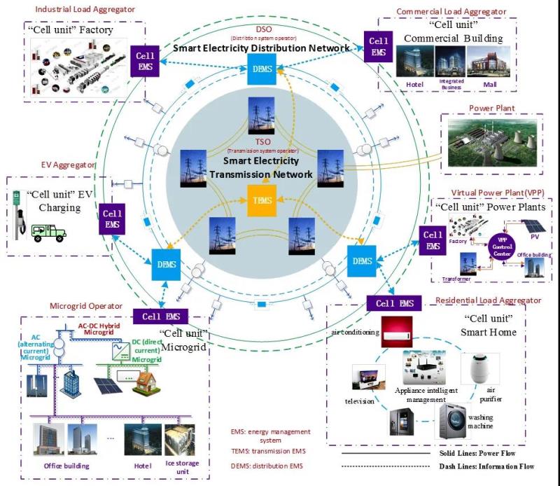 ③管理維度:體現(xiàn)微電網(wǎng)管理優(yōu)勢(shì)的重要內(nèi)容,更多的體現(xiàn)在信息流。微電網(wǎng)作為能源互聯(lián)網(wǎng)中的一個(gè)基本單元,承擔(dān)著大量分散、獨(dú)立分布式能源和靈活性負(fù)荷的管理任務(wù),大大降低了配電網(wǎng)的調(diào)度管理難度(避免維數(shù)災(zāi)),通過(guò)微電網(wǎng)與微電網(wǎng)、微電網(wǎng)與配電網(wǎng)的通訊和分層管理,更方便有效的實(shí)現(xiàn)系統(tǒng)整體的管理目標(biāo)。