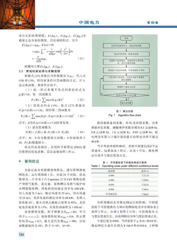 結(jié)論:本文在分析風電、光伏發(fā)電、傳統(tǒng)負荷預(yù)測誤差特性的基礎(chǔ)上,構(gòu)建了含有機會約束的微電網(wǎng)經(jīng)濟優(yōu)化運行模型,在考慮經(jīng)濟性和環(huán)保性2種目標情況下,引入環(huán)保算子衡量各地對環(huán)保的重視程度,將多目標問題轉(zhuǎn)化為單目標問題,并采用確定性解法,結(jié)合粒子群算法,處理模型的機會約束問題,對模型進行求解。在算例中,分析了不同置信水平、不同環(huán)境懲罰因子以及不同預(yù)測誤差對微電網(wǎng)運行成本的影響。結(jié)果表明:微電網(wǎng)運行成本將隨著環(huán)境約束的增強而提高,隨著預(yù)測精度的提升而降低,同時也驗證了確定性解法的優(yōu)勢。本文方法具有收斂快、耗時短等優(yōu)點,具備推廣應(yīng)用的理論基礎(chǔ)。